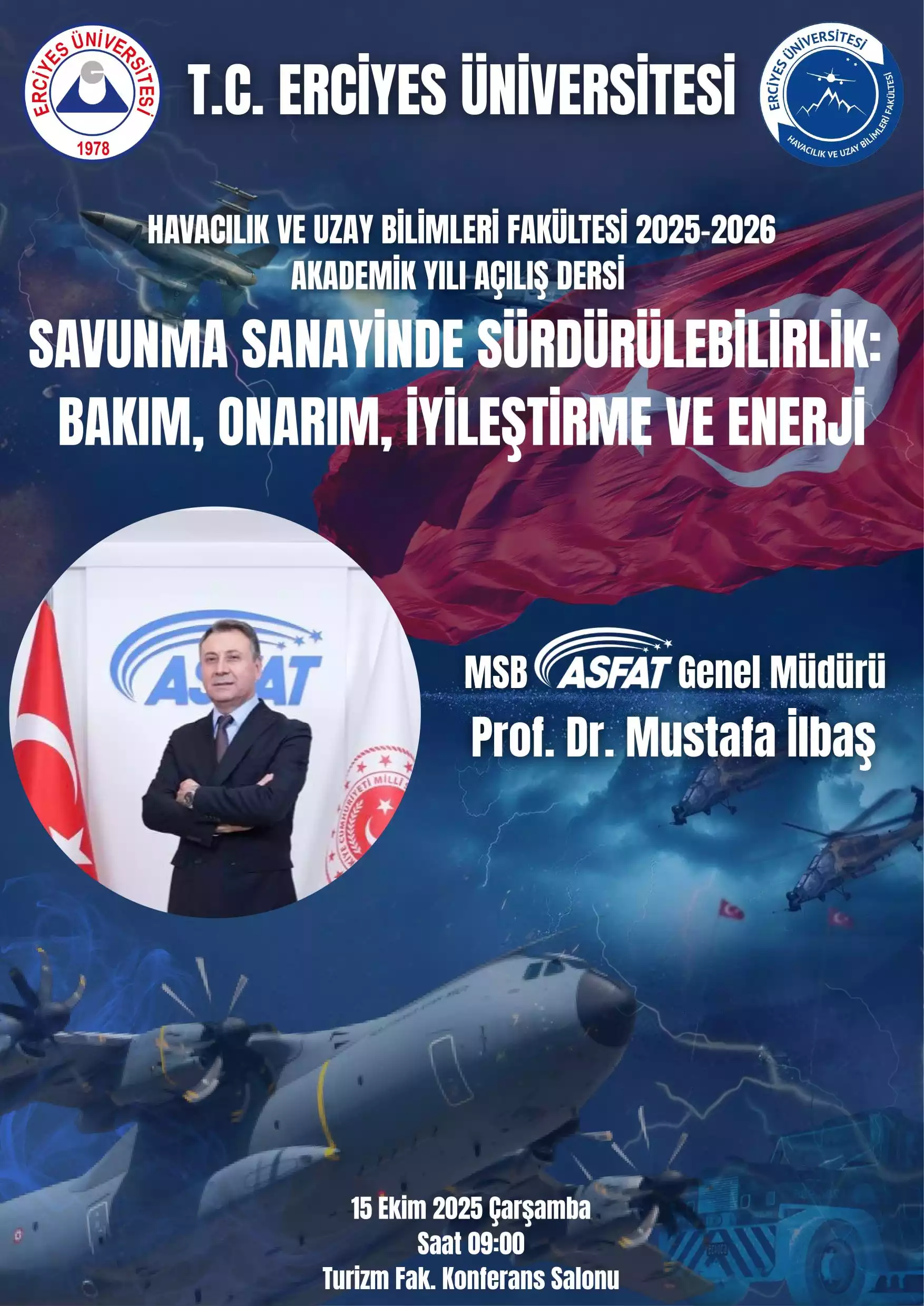 Erciyes Üniversitesi Havacılık ve Uzay Bilimleri Fakültesi’nin 2025–2026 Akademik Yılı Açılış Dersi, MSB ASFAT Genel Müdürü Prof. Dr. Mustafa İLBAŞ tarafından verilecektir.