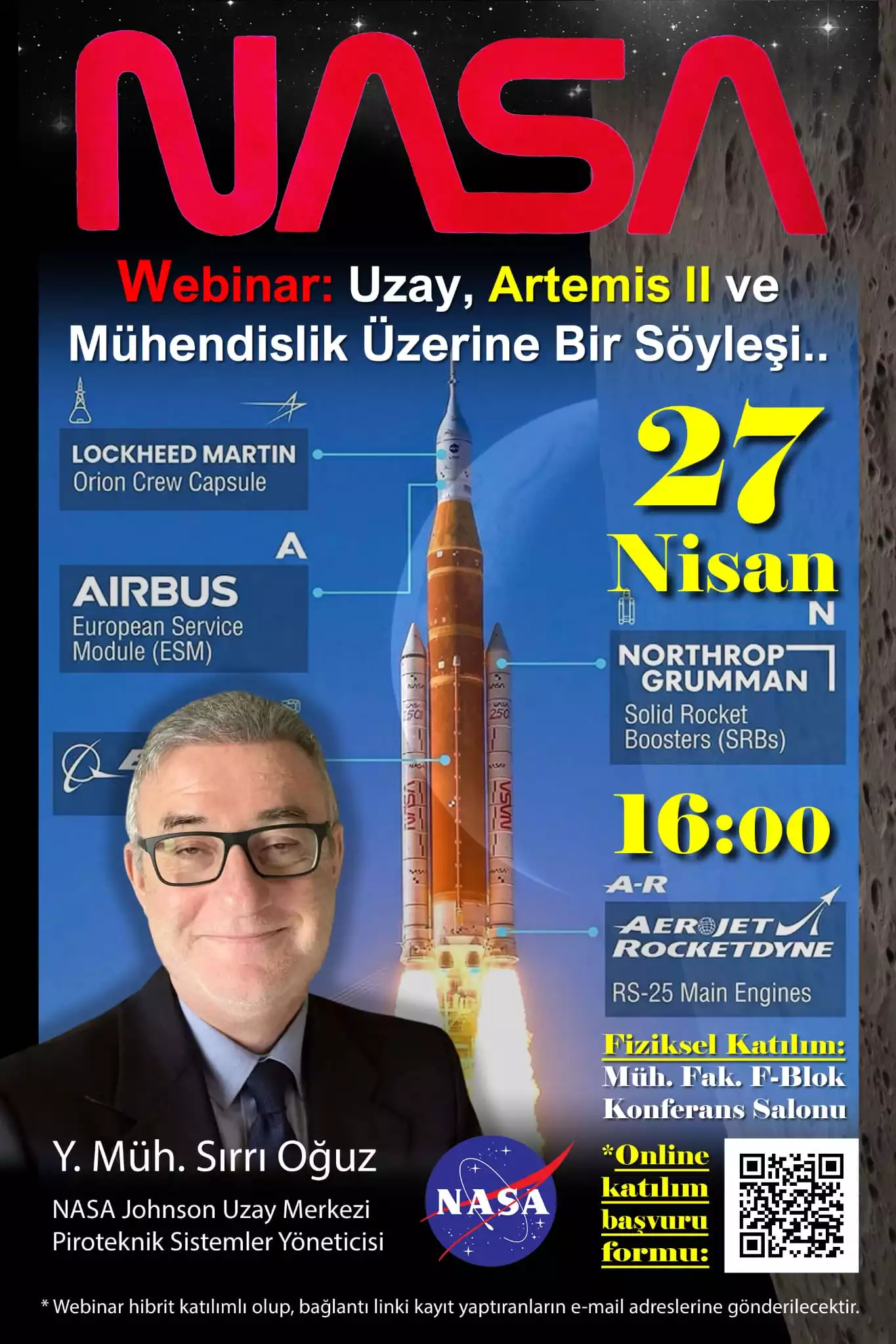 NASA Johnson Uzay Merkezi Piroteknik Sistemler Yöneticisi Y. Müh. Sırrı Oğuz’un konuşmacı olarak katılacağı “Uzay, Artemis II ve Mühendislik Üzerine Bir Söyleşi” başlıklı webinara tüm öğrencilerimizi ve ilgilileri davet ediyoruz